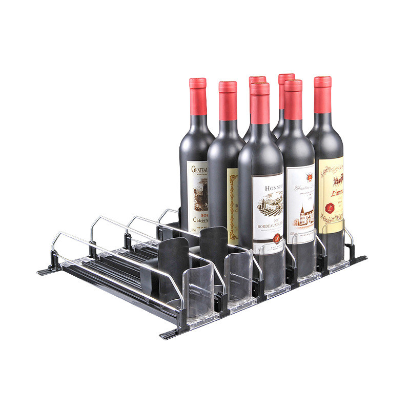 YOMO Display liefert Regal-Schieber, wir können spezielle Schiebergleisungen anpassen, die Ihren Bedürfnissen entsprechen, wie der Wein, er hat eine höhere Flasche, ein größeres Volumen und ein schwereres Gewicht als gewöhnliche Getränke.Wir haben den Weinschub speziell dafür entwickelt, diese zu behandeln.